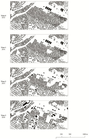 The change in the built form of the Fikirtepe area between 2012 and 2018 (time 0–time 3).