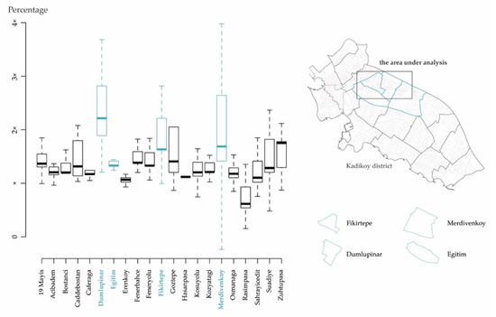Land price increases in neighborhoods of the Kadikoy district between 2012 and 2018. They were calculated with real values of cadastral land prices obtained from the Kadikoy municipality. The area under analysis comprises parts of the Dumlupinar, Egitim, Fikirtepe, and Merdivenkoy administrative neighborhoods’ limits.