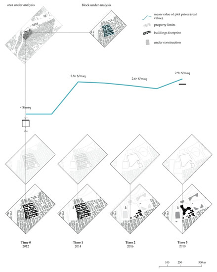 First, the changes in the built form and in the land prices for a given period of time were observed independently (Figure 1 and Figure 2). Next, the different categories of information were superimposed in chronological order and in biennial intervals for the length of time where the transformations occurred (Figure 3). To construct the whole image, it was necessary to pay attention to a handful of details. First, capturing the widespread effects of meta-trends on the local built fabric is only possible through microscopic sampling. In this case, an urban block was taken as a molecular sample, and proper information on its main urban elements (streets, plots, and buildings) was distinguishably associated. Second, the data for an accurate local analysis at this scale are usually available from local data sources.