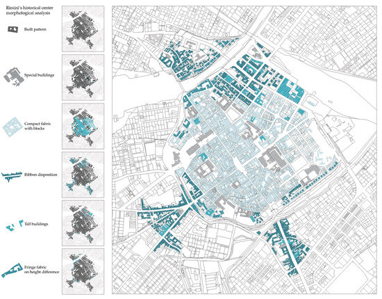 Morphological analysis of Rimini’s historical center. A formal classification of the urban fabric starting from the built pattern and identification of five morphologically homogeneous intramural and extramural areas.