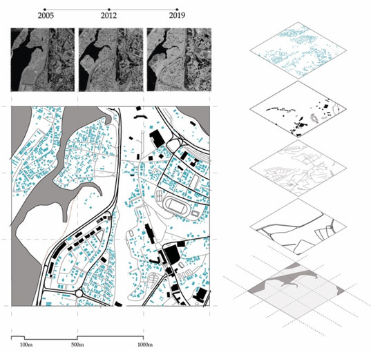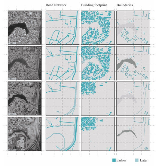 The results of mapping at the urban scale show an alternative to the non-existing official information from which some considerations can be made. Signs of evictions and relocations, signs of reclaimed land, and modifications due to important urban infrastructure projects can be found through a comparison of the samples’ morphologies. At the block scale, critical aspects of informal processes can be observed. Street layouts and plots do not appear before buildings, but they develop together. This incremental process of co-evolution makes the assemblages highly resilient and adaptable. Incrementality is recognized as a key characteristic of these assemblages and as a characteristic that could solve some of the problems linked to their seemingly chaotic nature in a step-by-step process of upgrading [49].