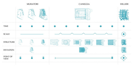The diagram became a vehicle that registers a process of becoming [30], and for this reason, it is even able to read permutations in a more performative way. To understand how permutations can be read through a morphological study, one should start from the beginning of the analysis and address the elements deduced from typo-morphological maps—scale, space, time, structure, and deviation—which define the process of transition. The study of Venice by Muratori, the maps of Como by Caniggia, and Hillier’s analysis provide a starting point for a methodological analysis of the behavior of maps according to the study of urban morphology (Figure 7).