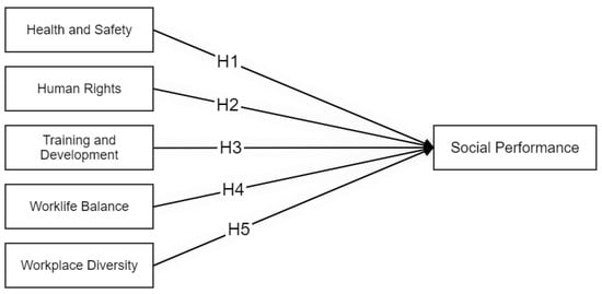 Internal CSR can enhance employee involvement, engagement, and identification in an organization. To derive optimal benefits from ICSR, ref. [91] proposed that CSR should be clustered into four categories, namely: health and safety, employee skills, the wellbeing of employees, and social equity. These components have been a source of doubt among employees and a source of contradiction between employers and employees [92]. Improving social performance has been a significant concern for stakeholders [93]. Therefore, an organization’s ability to reduce this misfeeling on these CSR initiatives can obtain higher productivity as well as organizational performance. As seen in the research of [94], ICSR activities have a positive impact on organizational social performance. Based on the reviewed literature, this study proposes the following hypotheses in Table 1.