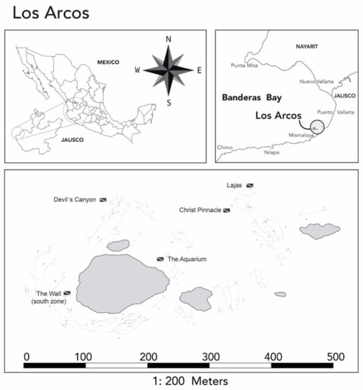 Los Arcos is located in Jalisco, in the central Mexican Pacific (Figure 1), a transition zone influenced by the cold current of California and the Gulf of California from the north, and the warm current of Costa Rica, as part of the northwestern current coming from the south. These currents combine to produce a region of high biodiversity [51].