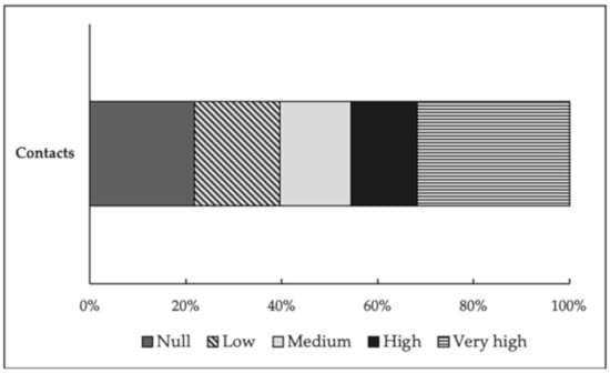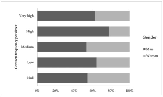 Regarding gender, the average number of contacts among men was 109, which is within the “very high” category. By comparison, women averaged 75 contacts, corresponding to the “high” 61–100 frequency (Figure 3).