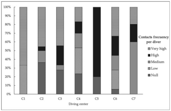 Regarding the observed diving centers, more than one-third of their divers were found to be make high-frequency contacts (C1–3, C6), in contrast to just one diving center (C4) that had a higher percentage of divers in the low-contact frequency (Figure 4).
