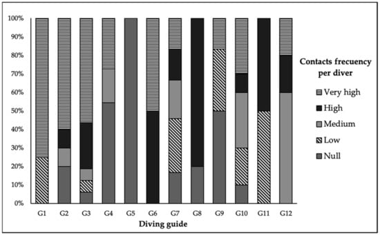 Similarly, only SCUBA divers of three leaders corresponded to “very high” frequency contacts, and only the divers of one leader remained completely within the “null” frequency (Figure 5).