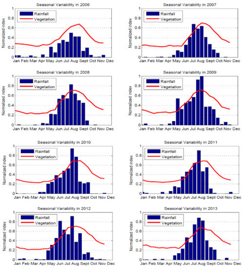 - Hashemi, S.A. Investigation of Relationship between Rainfall and Vegetation Index by Using NOAA/AVHRR Satellite Images. World Appl. Sci. J. 2011, 14, 1678–1682. [Google Scholar]