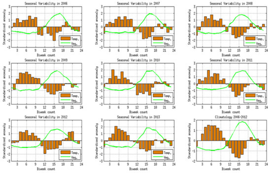 - Wang, J.; Rich, P.M.; Price, K.P. Temporal responses of NDVI to precipitation and temperature in the central Great Plains, USA. Int. J. Remote Sens. 2003, 24, 2345–2364. [Google Scholar] [CrossRef]