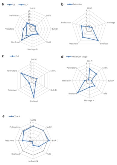 Summary effect sizes for the responses of ecosystem services to different experimental treatments. An effect size represents the difference between the mean population responses of two different treatment groups. This difference is divided by the pooled standard deviation. Note not all ecosystem services were measured for each treatment, and effect sizes differ between treatments (the 0 axes are thickened on each spider diagram for clarity). (a). Seed treatment; GL (grasses and legumes), and GLF (grasses, legumes, and forbs) compared to G (grasses). (b). Cultivation; minimum tillage compared to conventional deep ploughing. (c). Management type; cutting regimes compared to grazing. (d). Management intensity; extensive compared to intensive. (e). Year; final year (year 4) compared to the establishment (year 1) to indicate the directional trends. The model output for each year is given in supplementary Table S3. Yield = dry matter yield, Herbage N = herbage nitrogen content, Pollinators = pollinator abundance, Predators = predator abundance, Bulk D = bulk density, Soil C = total carbon, Soil N = total soil N, Birdfood = total invertebrate biomass.