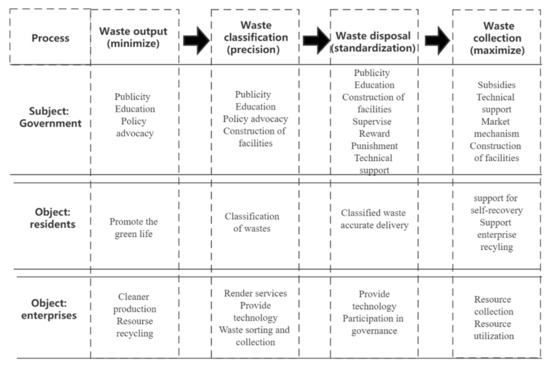In order to minimize the output of domestic waste, standardize the classification and maximize the recovery of resources, the government plays diverse roles in each stage. As showed in Figure 1, in the garbage generation and classification stage, the government is mainly providing classification infrastructure, responsible for publicity and education, raising residents’ awareness of environmental protection and regulating the sorting behavior. At the waste disposal stage, the government, on the basis of publicity and education, provides classification facilities, conducts supervision and guidance, economic incentives and cooperates with enterprises to provide technical support. At the stage of waste collection, the government and enterprises are at the core of responsibility, and the government + enterprise operation mode is adopted to maximize waste collection.