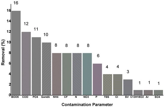 The polluting parameters mostly analyzed in phytoremediation processes in constructed wetlands are shown in Figure 3. BOD5 and COD of urban public wastewater discharges were the most examined parameters. They both describe the degree of water contamination. The ornamental species most commonly used in phytoremediation appeared to be Zantedeschia aethiopica and Spathiphyllum blandum.