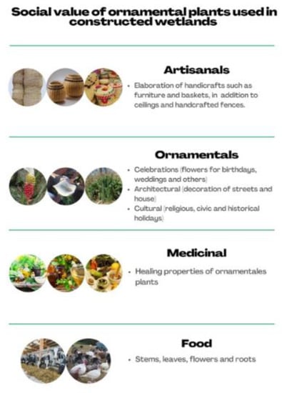 In this study, the social potential was classified as ornamental, artisan, medicinal, and food. Therefore, plant species can be used as raw material in the elaboration of handicrafts, flower arrangements, and the cultivation of seedlings in pots that can be marketed in small quantities, as shown by some works [13,48]. At the same time, a culture promoting the efficient use of natural resources would develop in localities where CW planted with ornamental flowers are constructed, such as the Pinoltepec project in the municipality of Emiliano Zapata, Veracruz, Mexico [13]. To take advantage of the social potential that ornamental plants have, it is important to describe their uses considering the benefits they provide to the society, i.e., artisanal, ornamental, cultural, and medicinal benefits (Figure 4).