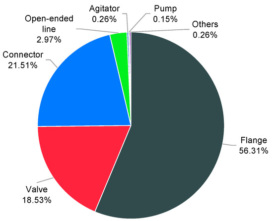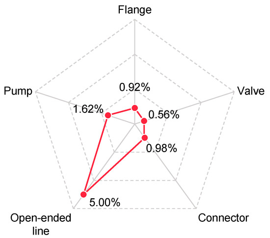 Open-ended lines, agitators, pumps, and other types of components contributed 5.33% of the leakage. It is particularly noteworthy that the number of pumps accounts for only 0.15% of the components, which is so low as to be almost negligible, while they contribute 1.94% of the leaks.