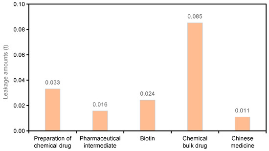 The levels of VOC leakage per unit of product output in the nine enterprises investigated in the study were also analyzed (Figure 7). As the output from enterprise A includes 190 tons of chemical bulk drug and 40 tons of pharmaceutical intermediates annually, the leakage amounts cannot be allocated to different product lines. Therefore, it was not included in the analysis. Among the enterprises producing different types of products, VOC leakage per unit product output was highest for chemical bulk drug production, at an average of 0.085 t/a, while the same value was lowest for enterprises producing traditional Chinese medicine, at an average of 0.011 t/a. The latter accounted for only 12.80% of the former. The average VOC leakages per unit product output of enterprises producing preparation of chemical drug, pharmaceutical intermediates, and biotin were 0.033, 0.016, and 0.024 t/a, respectively. Obviously, the leakage from chemical drug production should be a priority for control.