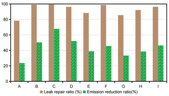 The leak repair and emission reduction ratios of the enterprises are shown in Figure 8. As shown in Figure 8, the leak repair ratios of the nine enterprises investigated in this study ranged from 78.29% to 100%. However, the emission reduction ratios after the repairs were very varied among the nine enterprises, with a maximum of 67.72%, minimum of 23.55%, and an average of 44.02%. In general, the higher the repair ratio, the higher the reduction in VOC emission ratio.