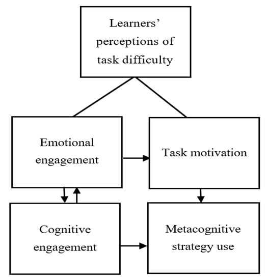 Additionally, in learning activities, learners engage in performing tasks emotionally and cognitively [45]. Emotional engagement refers to learners’ affective reactions (e.g., interest, confidence, motivation, and anxiety) to learning tasks and learning environments. In contrast, cognitive engagement refers to the approaches taken by learners to perform tasks, which highlights learners’ efforts in conducting cognitive and metacognitive activities to regulate their learning process. The two types of engagement commonly work interactively, influencing each other, and as a result, how learners perceive task difficulty affects their emotional engagement [46]. Therefore, when learners’ emotional engagement is negatively affected by their perceptions of task difficulty, their cognitive engagement, including their use of metacognitive strategies in engaging in the tasks given, will be impacted in an adverse manner. This will further influence their emotional engagement [45,46,47]. Drawing on the above exposition, a model that reflects the effects of task difficulty on metacognitive strategy use from the perspective of learners can be established in Figure 1.