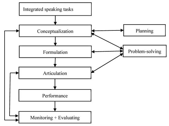 In the existing literature on L2 speaking, models generated in the research field of psycholinguistics are widely recognised and applied in understanding the phenomenon of L2 speaking (e.g., [14,50,51,52]). Among them, Kormos’ [14] Bilingual Speech Production Model is “more elaborate and more targeted” [52] (p. 397), and has been regarded as the major L2 speech production model that illustrates the working mode of L2 speakers’ speaking ability or their metacognitive strategy use [21,22]. As a result, this model has been employed in many empirical studies on L2 speaking (e.g., [14,50,51]). Considering its solid theoretical grounding and strong empirical support [50,51,52,53], our review of how metacognitive strategies work in the context of integrated speaking tasks was conducted within Kormos’ model, as stated previously.