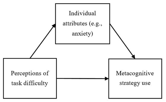Many researchers hold that task motivation elements are immediately connected to learners’ perceptions of task difficulty. In other words, an increase in task difficulty perceived by learners typically attributes to a decrease in their self-efficacy, expectancy-value, intrinsic motivation, and interest. The combined decrease then leads to the decrease in learners’ overall task motivation (e.g., [37,41,42,43,44]). As task motivation is the macro aspect of learners’ motivation that determines metacognitive strategy use as noted above, the increase in learner’s perceptions of task difficulty will in the end result in the decrease in their metacognitive strategy use.