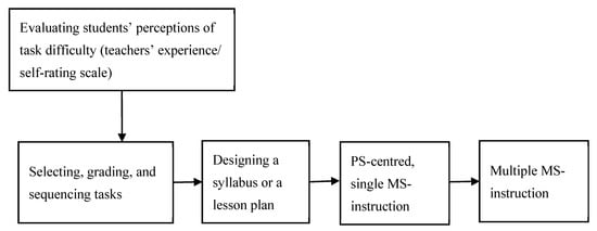 From the perspective of tasks, we propose that in syllabus design for implementing metacognitive instruction in EFL speaking classes, EFL teachers need to consider selecting, grading, and sequencing speaking tasks in line with how their students evaluate these tasks, especially how they perceive the difficulty involved in them. By doing so, the teachers can make sure that the tasks that they prepare for their metacognitive instruction can be appropriate for their students in terms of language proficiency levels [9,10]. Otherwise, if the tasks are perceived by the students as too easy or too difficult, their motivation and engagement in performing these tasks may be weakened [37,38,39], and accordingly, they may not use metacognitive strategies as expected by their EFL teachers. In the end, the teachers’ pedagogical purpose of metacognitive instruction may not be achieved due to the tasks per se. To gain the knowledge of how students perceive task difficulty, teachers can use their own teaching experience or use the self-rating scale, as endorsed by Ellis et al. [9] and Sasayama [49]. Figure 5 illustrates the possible procedure for ascertaining students’ perceptions of task difficulty.