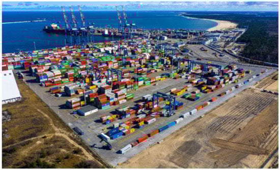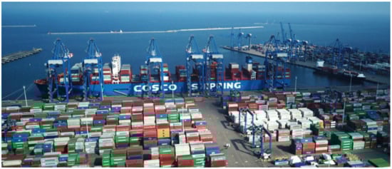 World container volumes continue to grow with the introduction of grater containerships into major trade routes. The port industry is under pressure to deal with the ever-increasing freight volume. Containerships of 24,000 TEUs plus are common for the terminals which serve as the main hubs. Larger ships wait longer than smaller units due to the difficulty in allocating the proper seat on the berth []. In addition, the available stacking area and the number of handling equipment can be limited, extending the time for loading/unloading operations []. The terminal operation activities related to its landside, such as outbound containers transportation using internal moving vehicles (IMVs) and their stowage into the assigned storage yards was studied in []. The dynamic data mining of ship container route loading under the international logistics environment was realized in []. In addition to the above-mentioned problems, gate congestion at a marine container terminal is considered a major issue facing truckers who come to the terminal for container pickup and delivery []. As a consequence of a large volume of cargo entering or leaving a port via road, congestions or emissions often become a social problem even in the large area adjacent to the terminal [].