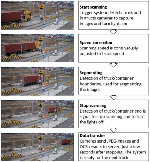 OCR is based on images, the better the image, the better the OCR result will be. In addition to the OCR processing, the quality of images is as well important for efficient exception handling: the best exception help desk is worthless without the availability of good, high-resolution and ‘readable’ images. Acquiring the images and OCR data on the road gate is not a simple task, the typical camera and OCR process when a truck is passing the portal is presented in Figure 4.
