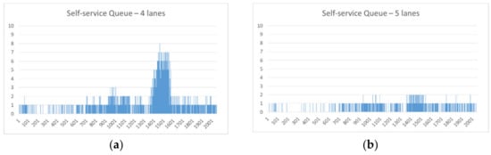 Self-service queue—4 (a) vs. 5 (b) lanes comparison.
