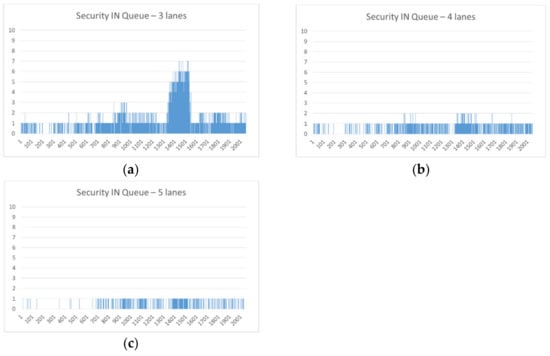 Security IN queue—3 (a) vs. 4 (b) vs. 5 (c) lanes comparison.