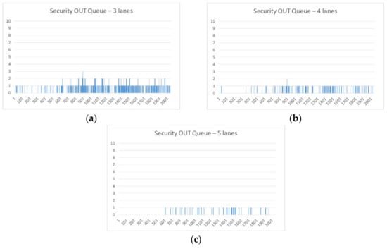 Security OUT queue–3 (a) vs. 4 (b) vs. 5 (c) lanes comparison.