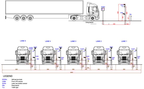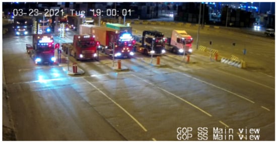 Taking all the above analyses and simulation results into consideration, the automated gate layout was built. Gate complex includes OCR portals with OOG line (2× IN and 2× OUT) as presented in Figure 11 and self-service 5× lanes, security in 5× lanes in and out 5× lanes as shown in Figure 12. Automated gate operation process implementation allowed us to automatize the handling of trucks at container terminal gates by using OCR (optical camera recognition), LPR (license plate recognition) technology and self-service kiosks for truck drivers.
