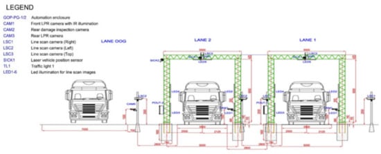 Road imaging OCR Portals and OOG bypass line as presented in Figure 11 are installed before entering and leaving DCT Gdańsk SA and are divided into functional zones using concrete fencing. Areas operate as drive-through lanes without stopping. Portals imagine and recognize truck and container data. Pictures are stored in the database for an appropriate time, later when the needed pictures can be exported to an external archive. On both areas the system will take pictures of: LPR cameras—truck registration, line scan cameras—container (two sides and roof), rear damage inspection camera—container doors.
