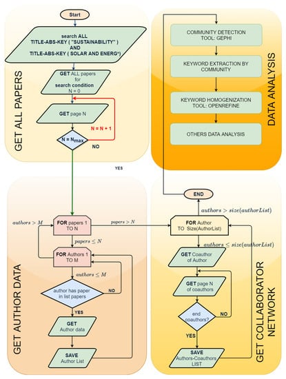 This work studies scientific world publications based on solar energy advances, oriented towards efficiency and sustainability, which are indexed in the Scopus database. This database is the one with the greatest number of publications worldwide []. The search engine used to automatically obtain bibliographic data was a rasNetBot API interface, developed at the University of Almería, by a research group from the Department of Engineering in recent years. The method described in [] has been used, improving the data mining and analysis part, as shown if the flow chart in Figure 1.