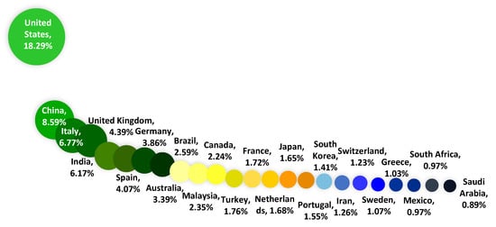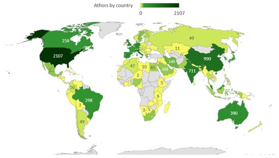The highest concentration of authors is in 25 countries, with a contribution of more than 100 authors per country (Figure 3). In this figure, 9207 investigators have been represented, equivalent to 79.91% of the existing total. The country with the highest contribution of researchers is the United States 2107 (18.29%), followed by China with 990 researchers (8.59%), Italy with 780 researchers (6.77%) and India with 710 researchers (6.17%). The remaining 21 countries have a percentage contribution of less than 5%. The results show that both United States and Asian countries are actively collaborating on progress by creating partnerships with other countries to move forward, as seen by the interlocking of communities. On the other hand, Europeans work among themselves, as is the case of Germans and Spaniards, who have established collaborations during recent years as is reflected in publications and cooperation agreements.