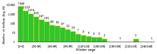 Figure 4 shows the logarithmic distribution of the H-index of the total of authors who publish about the study, 11,785 authors. The highest concentration of authors is shown in the lowest H-Index values, in the range from 0 to 9, with 7349 authors (62.36% of the total), of which 1.018 (8.60% of the total) have an H-index of 0 and 1.843 (15.60% of the total) have an H-index of 1. The ranges of 0–49 have 96.87% of the total. There are only 0.36% of authors with an H-Index value greater than 99, the maximum H-index value being 256 of the author M. Gräetzel (ID Scopus 35463345800).
