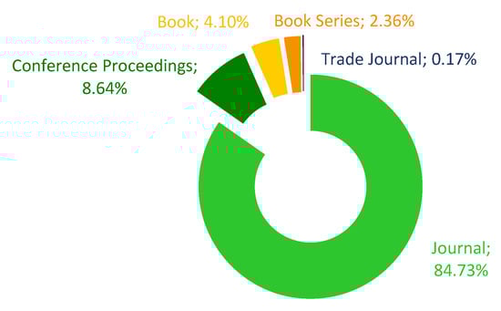 Figure 5 shows the distribution of the different publication formats of the documents found in the Scopus search. Articles are 95.02% of the total documents found (13,925 documents); 4.28% are Reviews (627 documents). The rest have a total contribution of less than 1%.