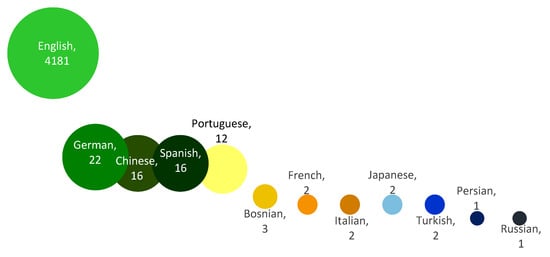 The languages present in the different publications are shown in Figure 6. This graph shows that the main language is English. It accounts the 98.15% of total papers. The preference of the researchers is English-language journals. German is the second language for publications, and it contributes to 0.52% of the total publications. There are the same number of publications in languages such as Chinese or Spanish (16 works), less than 0.38% of the total. In addition, there is a wide variety of languages, such as Portuguese, French, Italian, Japanese or Russian, although the number of such publications is exceedingly small and negligible, 12 publications in the largest case (0.28%).
