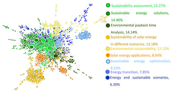 After the review process using keywords, 4260 documents were obtained that presented 2195 relationships. This information was treated later with bibliometric techniques and filtered until the 1146 documents with 1872 relationships were established. These documents are distributed in nine communities according to the subject matter and the collaborations present between the authors. The largest community is Sustainability assessment (15.27% of the documents), followed by Sustainable energy solutions (14.40%) and Environmental payback time analysis (14.14%). The next two communities are slightly smaller in size, 13.18% and 12.13%, being the Sustainability of solar energy in different scenarios and Environmental sustainability communities, respectively. The rest of the communities are smaller than 9%, Solar energy applications (8.64%) and Sustainable energy optimization (8.20%) are similar in size. The smallest communities are Energy transition (7.87%) and Energy and sustainable scenarios (6.20%).