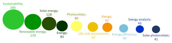 This work has analysed the research collected in the publications of sustainability associated with the topic of solar energy, from 1995 to 2020. In the publications studied, a total of 2746 keywords were obtained. The keyword with the highest appearance is Sustainability, with 286 repetitions (10.41%). The next most important words according to the number of repetitions are Renewable energy (6.5%) and Solar energy (4.6%). The 10 most globally repeated words are among the 10 most repeated of each community separately and together they constitute 37% of the total of the existing words. All of them are related to the theme of sustainability, renewable energy and concepts related to solar energy. The rest of the words appear on a small number of occasions, so their size compared to the rest is small and they represent less than 1% of the total of the keywords, as it happens with Environmental impact (0.9%).