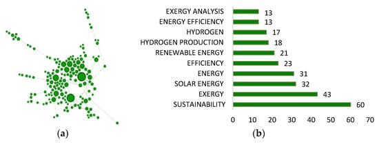 Figure 11b represents the top 10 of the most repeated keywords in the community, with 9.8% of the total keywords. The most repeated word in this community is sustainability, being also the most repeated word globally. Besides, its frequency of appearance represents 22% of the repetitions that raise the top 10 words in this community, a frequency higher than that present in other larger communities. Other words represented in the top 10 of this community are located among the top 10 of global keywords. An example of this is the words Solar energy, energy, renewable energy efficiency or energy analysis. The second word with the highest appearance is exergy (16%). It is not located among the five with the highest global frequency, but it is among the 10 most repeated. Exergy is a concept of vital importance in this community as it is considered a key factor in energy efficiency, its quantification and evaluation. Among the top 10 keywords there are only two concepts, hydrogen production (6.6%) and hydrogen (6.2%) that are not among the 10 global keywords, but among the 25 with the globally highest repetition.