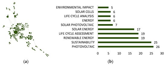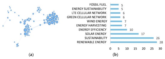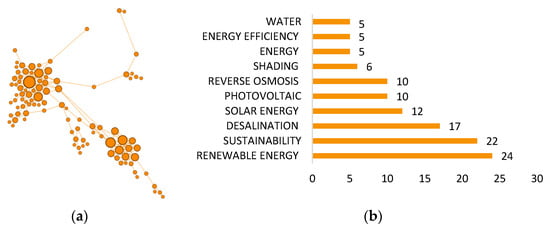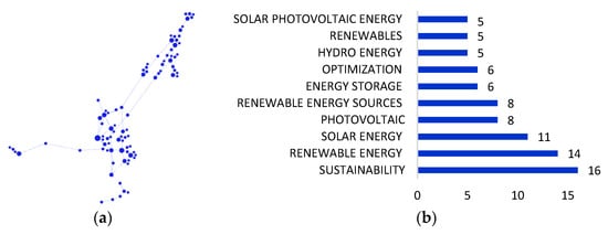 Figure 10b represents the top 10 keywords of this community and their number of appearances, which constitute 6% of the total keywords. Among these 10 words, sustainability and renewable energy are the two words with the highest frequency of appearance at the global level and both represent 35% of the total of the words present in this community. Seven of the 10 most repeated words in this community are among the globally repeated words (Figure 7), as they consider issues related to the evaluation of sustainability, one of the most studied aspects in the documents discussed.