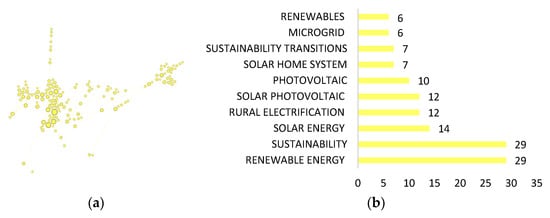 This community is made up of 162 documents. It is the third community in size with a contribution of 14.14% of published documents. In Figure 7, it is located at one extreme because the topic discussed maintain relationships with the communities: Sustainability assessment, Environmental sustainability, Solar energy applications, Energy transition and Sustainable energy optimisation. Figure 12a shows the concentration of the nodes, the main node and 11 medium-sized nodes are observed. The three main nodes are: