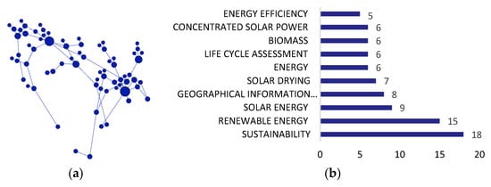 This community is the smallest and its keywords are 13.51% of the total. The representation of the 10 most important keywords of this community is shown in Figure 18b and they represent 23.18% of the total of its keywords. The keyword with the highest number of repetitions coincides with the most globally frequent word, sustainability, which represents 4.85% of the total words in the community. As in most communities, 60% of the keywords in the top 10 matches the top 10 of global keywords. An example of this is the words renewable energy (4.04%), solar energy (2.43%) or life cycle assessment (1.62%). The rest of the words that make up the top 10 are words of a different nature, with an exceptionally low frequency, as occurs with geographical information (2.16%), solar drying (1.89%) or biomass (1.62%).
