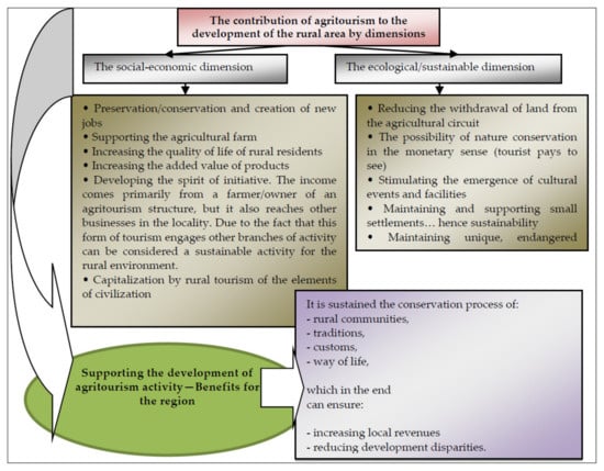 - Also the period of difficulty, through which the agricultural sector, has passed and is passing in many developing areas, rich in terms of rural resources, is a motivation for the development of agritourism, where there are favorable conditions. Because many of the entrepreneurs, from the agricultural field, did not have where to market the obtained products, it was necessary to diversify the possibilities of direct marketing, agritourism was representing such a possibility. Combining the two activities, agriculture and tourism, under the concept of agritourism, has generated the opportunity for a sustainable development of the rural community, over a longer period of time, and it generates at the same time the growth of other local businesses. Consequently, the actions are first in the direction of an economic development of the community. After increasing incomes, investments will increase as well, which will generate the expansion of economic activities in rural areas, but also the emergence of new businesses, which as a whole, will support local industry. Another aspect will be the intensification of trade due to tourists, which will generate a future direction of investment earnings, primarily in improving living conditions, or various facilities. The localities within which agritourism activities appear and are practiced, will take an important step in the direction of a sustainable future development [19,20,21]. The current trend, specific to many rural areas, implies a sharp decline from an economic point of view, the disappearance of interest in engaging in agricultural activities or starting a business in rural areas. At the same time, however, there has been a change in consumption habits/patterns and consumer behavior in the sense of registering a strong demand for “natural, organic products” in all areas. In this context, agritourism can be a means of diversifying rural economies in rural areas, a possibility to capitalize on unique resources. Consequently we state that it can be a winner, in terms of sustainability. It is true that this growth could not be completely a sustainable one, and the focus should be on authenticity of traditional products. These represent the identity of popular localities. Strong partnerships are intended to ensure mixing/blending of cultural activities, cultural heritage, gastronomy, agriculture, or simply the provision of a “short chain” aimed at supporting rural communities. What is certain is that in rural areas, where the emphasis was on capitalizing local resources, authentic resources through agritourism activities, the development was sustainable [22,23]. So the benefits of the development of agritourism activity concerning the quality of life standards may be, in many different ways, sustainable ones. Particularly the rural areas where this form of capitalization of local resources will be used can become the areas where the elements of local sustainable development will be assembled. The interest and the possibility to improve the infrastructure will arise, and they will contribute to bringing in the foreground the spiritual life of rural localities. This purpose may be realized through the strategic objectives concerning the human factor, technical endowments and heritage conservation [3,24].
