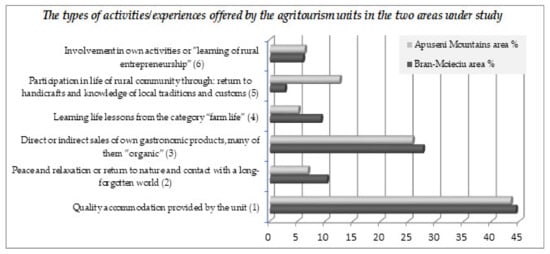- The analysis of the types of activities/experiences offered by the agritourism units from the two areas subject to the study, was a second sub-objective study in order to emphasize the motivation for which agritourism activity may be a business reality of the moment for Romanian rural sustainability from the two areas studied, the relevant information being illustrated in Table 4 and Figure 11.