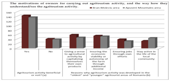- analyzing the types of activities/experiences offered, the motivation according to which the agritourism activity can ensure the sustainability is illustrated, both for the agricultural farm and the rural environment. Both areas under study are mostly mountainous areas, and the Bran-Moieciu area is located at the confluence of other tourist areas, and the length of stay is not high at present. The accommodation is the main element required by tourists, so both areas have identified the needs of the tourists and bent on their demand. Although they are somehow beginners in the field, many of the owners of agritourism businesses have identified quite well the opportunity and purpose of this activity, and they capitalize on the positional advantage that both areas have: the existence of many products and opportunities to obtain organic products. They have also identified aspects related to “participation in the life of rural community through: return to handicrafts and knowledge of local traditions and customs” which are capitalized by the studied areas, more timid it is true, but it represents a beginning, and we can say that there is “raw material” in abundance.