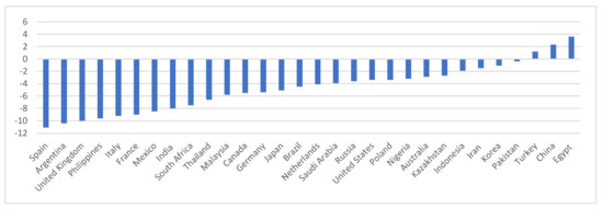 The COVID-19 pandemic outbreak has brought an unprecedented crisis, evolving from a health and social shock to the deepest global economic recession in nearly a century, causing more than double the impact of the 2008 financial crisis [45,46]. The quarantine and self-isolation policies imposed by many countries around the world to contain the spread of cases [47] has led to a halt for many businesses, reducing employment and economic activity worldwide [48,49]. As a result, regions have been affected by significant negative gross domestic product (GDP) growth rates and higher inequality and poverty rates [50] (Figure 1). The International Monetary Fund (IMF) [50] for 2020 forecasts a negative global growth of −3.5%, with a higher drop in real GDP in advanced economies (−4.9%) than in emerging markets and developing economies (−2.4%). Asia will have the first regional recession in almost 60 years. The economies of the United States, the United Kingdom, and Japan are projected to contract −3.4%, −10.0%, and −5.1%, respectively. Likewise, the IMF estimates a −7.2% economic recession in the eurozone, with Spain experiencing the greatest decrease in its real GDP (−11.1%) in the area, followed by Italy (−9.2%) and France (−9.0%). The economic growth of −7.4% is expected in Latin America and the Caribbean. Figure 1 shows the growth rates of real GDP in 2020 for 30 selected economies that account for approximately 83% of the world output, according to IMF estimates.