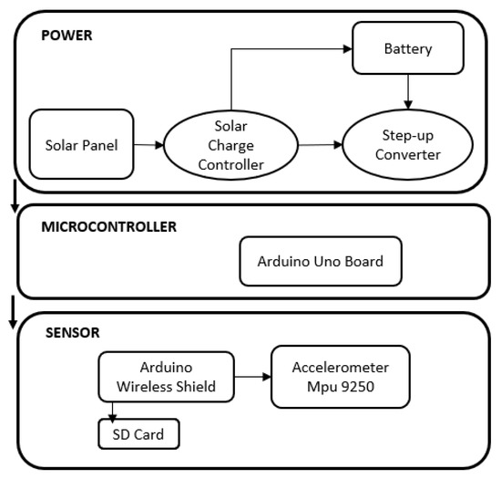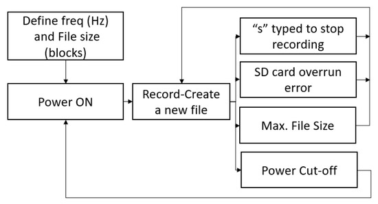 As addressed previously, LEWIS 4 is designed and built on an Arduino platform in order to enable low-cost implementation by owners. Arduino offers its own integrated development environment (IDE) and uses C++ coding language. Open-source Arduino libraries have been used and modifications have been introduced to enhance its characteristics and adapt it to the long-term deployment requirements. The software modifications make the system reliable and avoid errors while the sensor is recording. Two main modifications were made in order to achieve the goals for field implementation and use by stakeholders: energy consumption reduction and enabling a user-friendly interface. LEWIS 4 records data at a sampling rate of 250 Hz. LEWIS 4 also modifies the maximum number of blocks that a file can reach per file to 150,000 blocks, which is equivalent to 5.5 h of continuous recording. LEWIS 4 starts recording a new file automatically when the previous one reaches its maximum size. LEWIS 4 also starts recording automatically when the sensor is started. By default, the sensor, when powered, offers some options and waits for the user to type a command to start any of its functions. This modification introduced in LEWIS 4 leads the sensor to automatically start recording right after powering the sensor. This makes it simple to deploy and also means that it will automatically recover from a power loss, which was brought up as a potential need by stakeholders. Finally, LEWIS 4 automatically deletes incomplete files recognized by the code as temporary files that can cause the sensor to stop recording. In general, all these modifications are solutions to the different problems that researchers found during the development of the LEWIS 4 in conjunction with the Tramway deployment. Figure 4 shows the software architecture diagram of LEWIS 4.