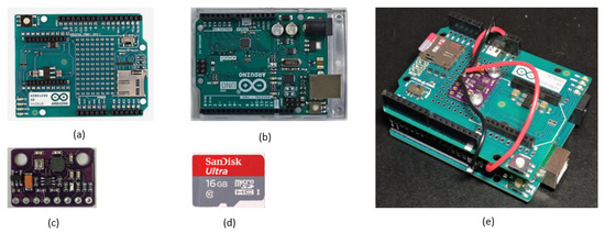 Sensor measuring elements: (a) Arduino wireless shield; (b) Arduino Uno; (c) GY-91 board (MPU9250); (d) 16 GB SD card; (e) assembled sensor.