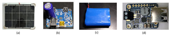 Power supply system elements: (a) solar panel output: 6 V 6 W 1 A; (b) solar charger controller input: variable 6 V panel–1 A (added 2 K; resistance), output: stable (3.7 V–1 A); (c) battery 3.7 V–6600 mAh; (d) step-up converter input: 3.7 V–1 A; output: 5 V–1 A.