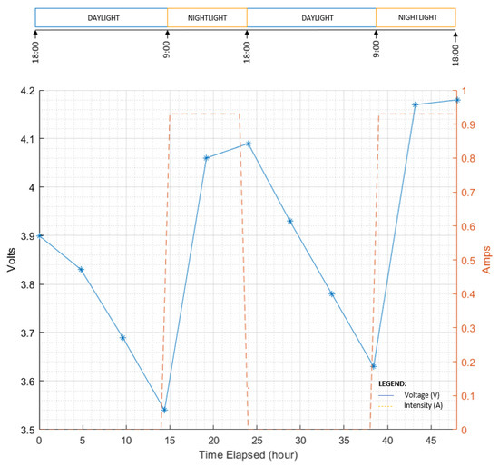 LEWIS 4 was tested in a controlled environment to check that the solar energy supply system enables the sensor to record uninterruptedly and to save the data correctly. Figure 5 shows the battery fluctuations through the day together with the amount of current provided to charge it by the solar panel during the 48 h experiment to test and validate the energy consumption design for LEWIS 4 prior to the field deployment. The sensor was set to record continuously during 48 h with a sunlight exposure of 9 h a day, which was determined to be the shortest daylight duration. We recorded the battery voltage every 5 h. Fortunately, the data showed that LEWIS 4 battery levels fluctuated as expected. The solar panel provided the current for charging the batteries at a fast rate during the two days of testing. The batteries were charged with energy to supply the sensor until the next day. In summary, the sensor recorded continuously for 48 h and the charge–discharge rate confirms that the system is able to supply energy at a sufficient rate to keep the sensor working uninterruptedly in good conditions in the field. In Figure 5 the blue line (continuous line) represents the battery voltage, which can be used to estimate its remaining capacity relating to the characteristic discharge curve of the battery. In Figure 5 the orange line (dashed line) shows the current provided by the solar panel. We found with this experiment that in the test conditions the solar panel worked at a 93% efficiency providing an average of 0.93 amps over the maximum output that is 1 amp. This current is enough to charge the batteries during the day so that they can keep the sensors working overnight. Note that during this test was performed in May in Albuquerque (NM) and the sky was clear so sun exposure was excellent.